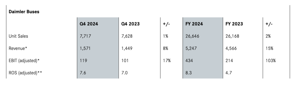 Daimler Buses s-a remarcat drept segmentul cu cele mai puternice performanțe din cadrul Daimler Truck în 2024. A înregistrat +15% venituri și +103% EBIT.