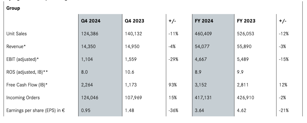Grupul Daimler Truck a raportat un venit total de 54,1 miliarde EUR. Cifra reprezintă o scădere cu 3% față de 55,9 miliarde EUR în 2023. EBIT a fost de 4.667 milioane EUR, o scădere cu 15% față de anul precedent.