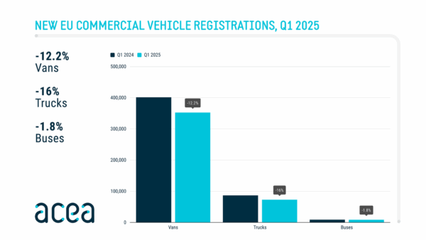 deCargo & Bus18 mai 2025Înmatriculările de camioane noi din UE au scăzut cu 16% în primul trimestru din 2025, față de T1 2024.