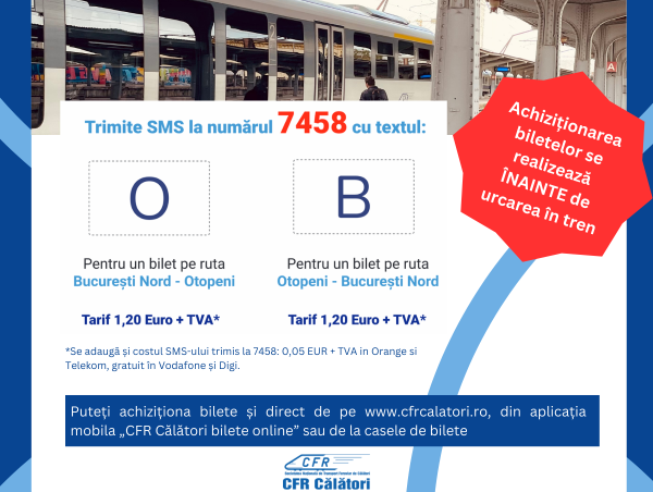 Titlurile de călătorie se pot achiziționa și prin SMS la numărul 7458 pentru trenurile CFR Călători de pe relația Gara de Nord București – Aeroportul „Henri Coandă” Otopeni și retur.